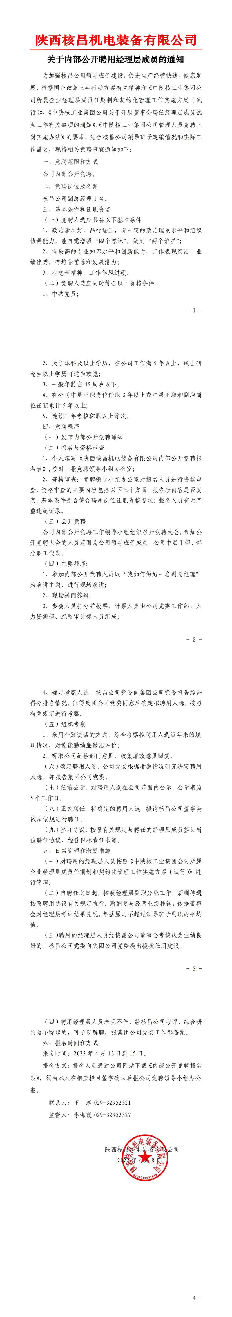 關(guān)于內(nèi)部公開聘用經(jīng)理層成員的通知