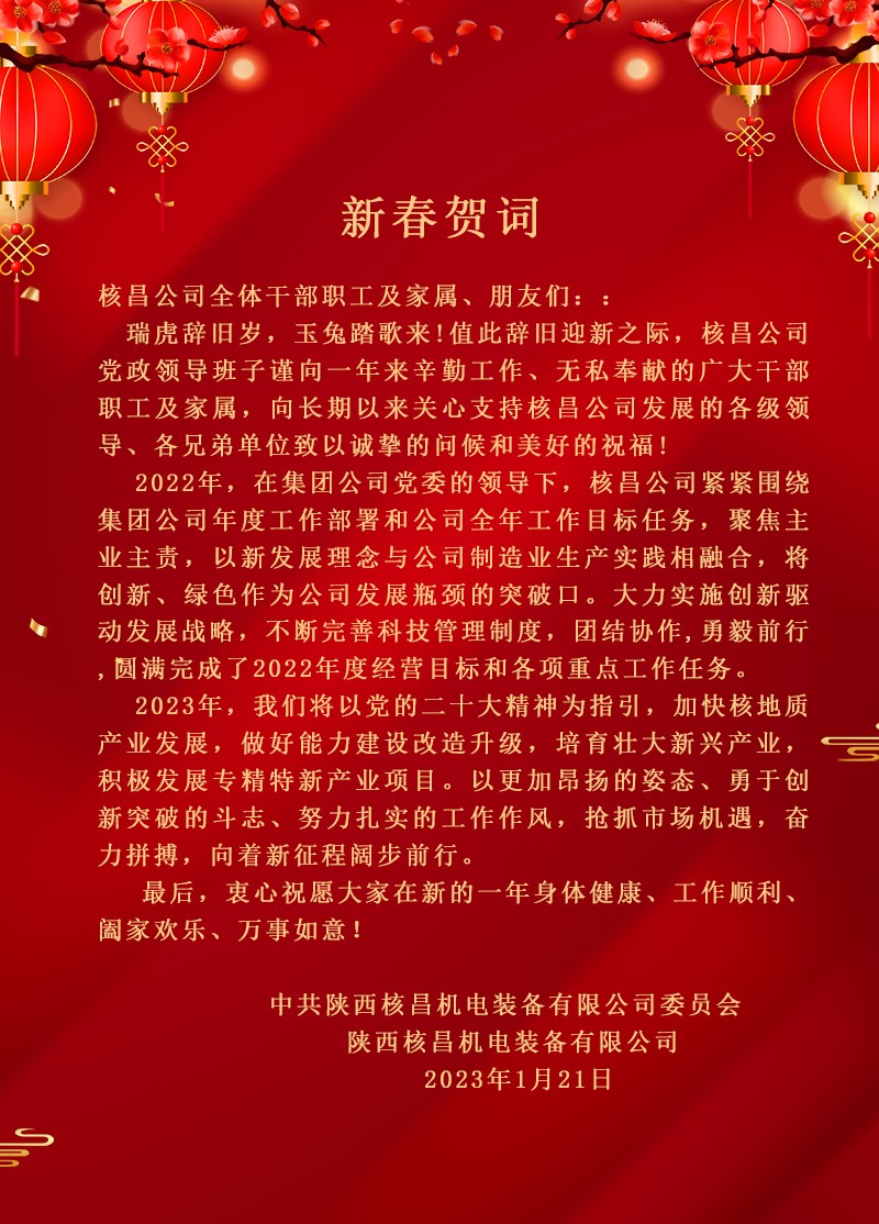 1月13日,在新春佳節(jié)來臨之際,咸陽市科技局副局長陳振寧一行來到核昌公司開展春節(jié)前慰問活動,為公司職工送去科技局的關(guān)懷與節(jié)日的祝福。核昌公司黨委副書記、總經(jīng)理李偉,副總經(jīng)理...
