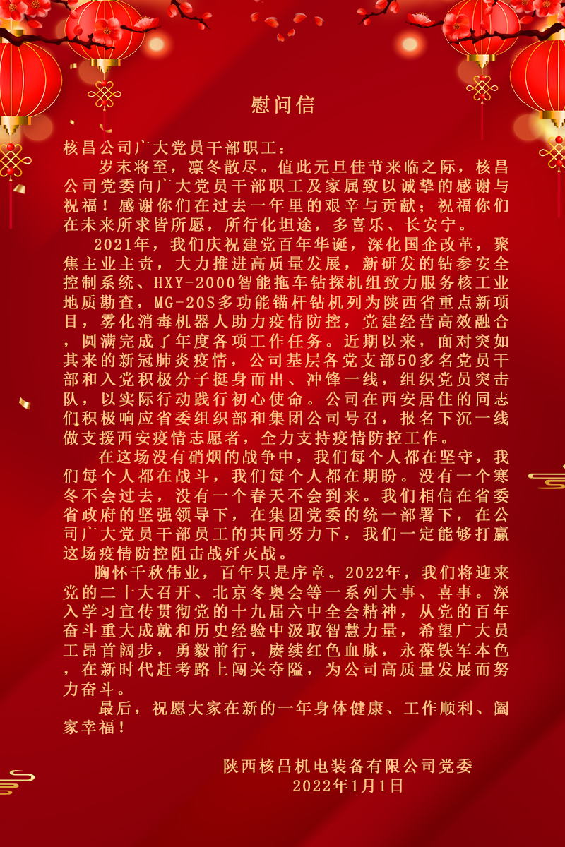 1月1日上午10時(shí),黨委委員、副總經(jīng)理、工會(huì)主席李偉一行來到公司單身職工宿舍,在元旦來臨之際,對(duì)九位就地過節(jié)的單身職工進(jìn)行節(jié)日慰問,送上公司黨政工的節(jié)日問候和美好祝愿。慰問時(shí)...