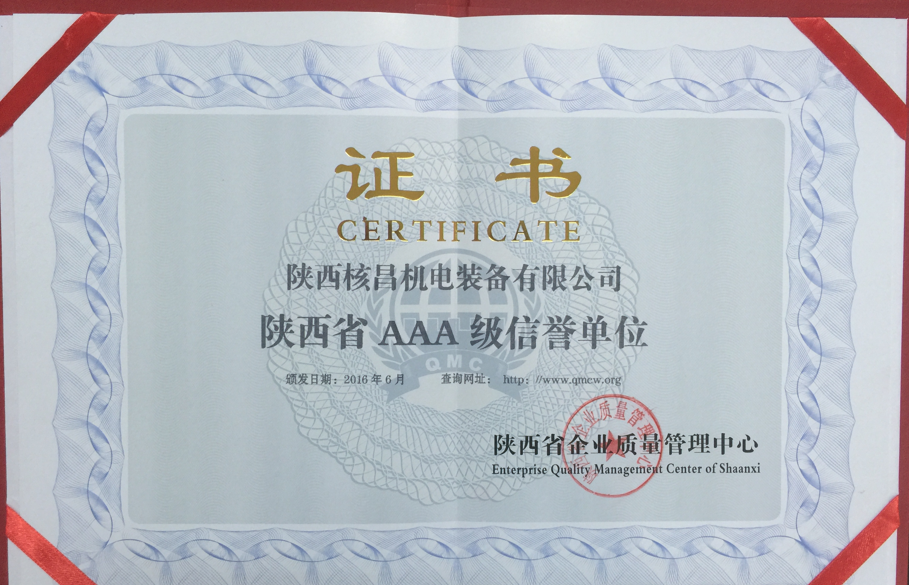2016年6月,在陜西省企業(yè)質(zhì)量管理中心開展的企業(yè)•質(zhì)量•誠信主題活動中,核昌公司獲 陜西省AAA級信譽單位榮譽稱號。近年來,核昌 ...