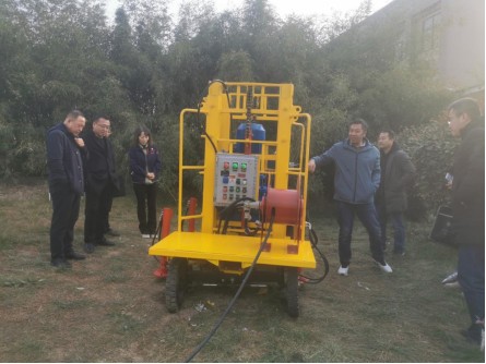 首先,參觀了電液一體化螺旋地錨設(shè)備,項(xiàng)目組詳細(xì)介紹了改進(jìn)部位、操作要領(lǐng)以及升級(jí)后的設(shè)備優(yōu)勢(shì),并現(xiàn)場(chǎng)進(jìn)行了遙控操作、轉(zhuǎn)向移動(dòng)、地錨打孔等演示。