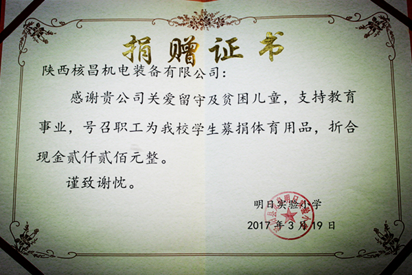 “傾心公益,傳遞愛心”,多年來,核昌公司干部職工一直熱心于公益事業(yè),主動(dòng)發(fā)揚(yáng)雷鋒精神。此次,核昌公司團(tuán)委通過組織職工為留守兒童募捐,希望在校學(xué)生提高鍛煉身體的意識(shí),幫助他們健康成長(zhǎng)。受捐學(xué)校舉行了捐贈(zèng)儀式,表達(dá)了對(duì)核昌公司職工的感激之情,并為公司贈(zèng)予了榮譽(yù)證書。