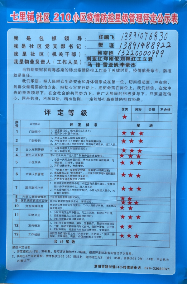 經(jīng)過秦都區(qū)政府相關(guān)部門檢查及社區(qū)測評(píng),核昌公司生活區(qū)的疫情防控工作受到了地方政府的肯定和好評(píng)。在社區(qū)“小區(qū)疫情防控星級(jí)管理評(píng)定公示欄”獲得優(yōu)秀評(píng)級(jí)。成績的取得歸功于組織的正確領(lǐng)導(dǎo)、一線同志的不懈擔(dān)當(dāng)和全體核昌人的共同努力。