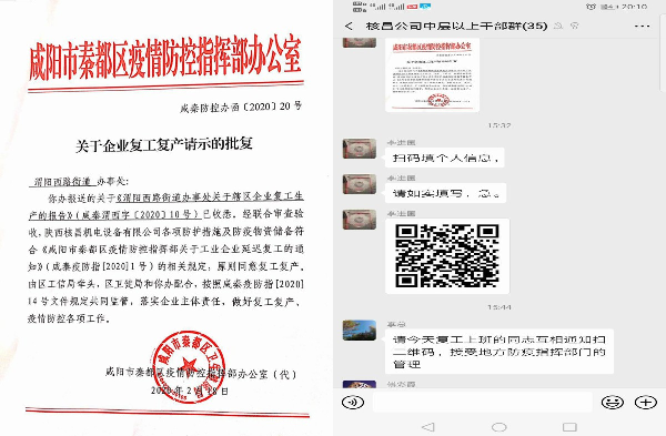 2月19日,核昌公司在不斷加強新型冠狀病毒疫情防控工作的基礎(chǔ)上。根據(jù)集團公司復(fù)工復(fù)產(chǎn)相關(guān)要求,經(jīng)咸陽市秦都區(qū)疫情防控指揮部辦公室批準,結(jié)合公司自身實際情況,自2月19日起恢復(fù)工作與生產(chǎn)并做好咸陽市疫情企業(yè)復(fù)工復(fù)產(chǎn)登記工作。